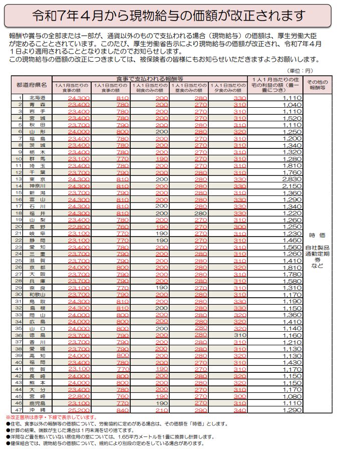 全国の現物給与価額は厚生労働大臣が定めており、価額の改定があるか否かはその年によって異なります。