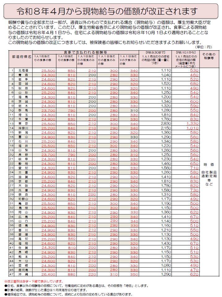 今年、現物給与の価額が改定されました。ここでは、2026年度(令和8年度)4月1日より適用された現物給与価額の改定内容をご紹介します。